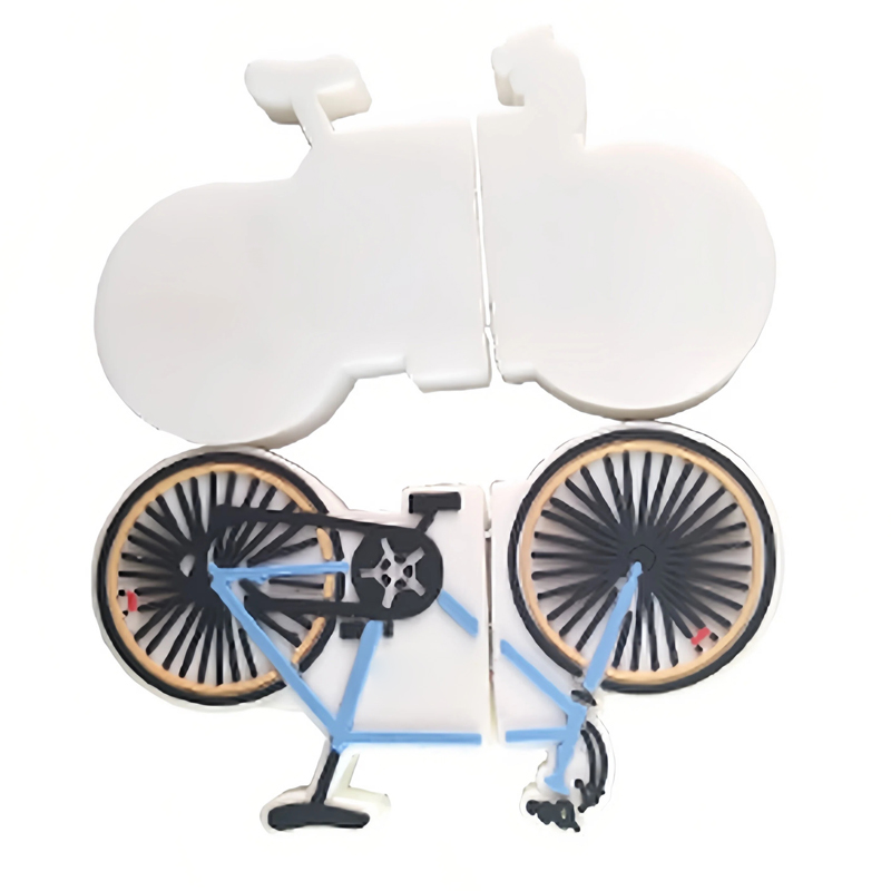 這款卡通自行車U 盤以經典自行車為設計原型,用柔韌耐磨的 PVC 軟膠材質復刻出細節感拉滿的騎行外觀:彎把曲線清晰靈動、鏈輪與腳踏結構仿真還原、鑲淺棕邊框的黑色輪圈質感細膩,淺藍線條點綴在干凈的白色主體上,清新又充滿活力。