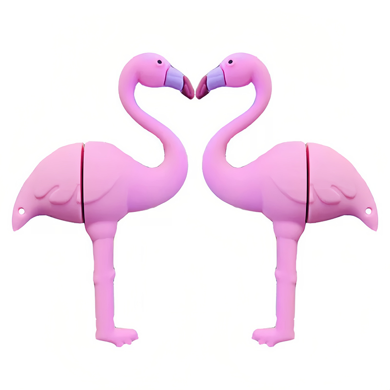 這款 U 盤以愛心火烈鳥為外形設計:整體采用柔粉色pvc軟膠材質,還原了火烈鳥圓潤蓬松的體態,兩只火烈鳥的脖頸自然彎曲交疊,恰好形成浪漫的心形輪廓;細節處點綴了淡紫色喙與黑色小眼睛,讓造型更生動可愛。U 盤采用分體式結構 —— 其中一只火烈鳥的身體是 U 盤主體(內置 USB 接口),另一只則是配套保護蓋,使用時拔出主體即可。