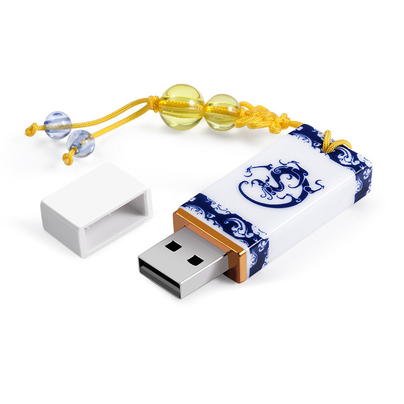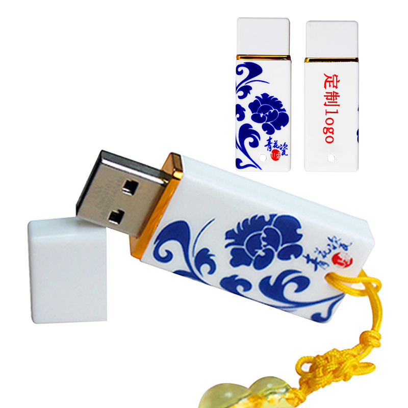 經典款陶瓷U盤采用青花瓷材質燒制,有青花瓷,青花韻,龍鳳等多種圖案選擇,其中以青花瓷居多,U盤正面是青花瓷圖紋,背面可以印制logo或是文字,同時還配有高檔禮盒包裝,包裝上也可以定制廣告語。